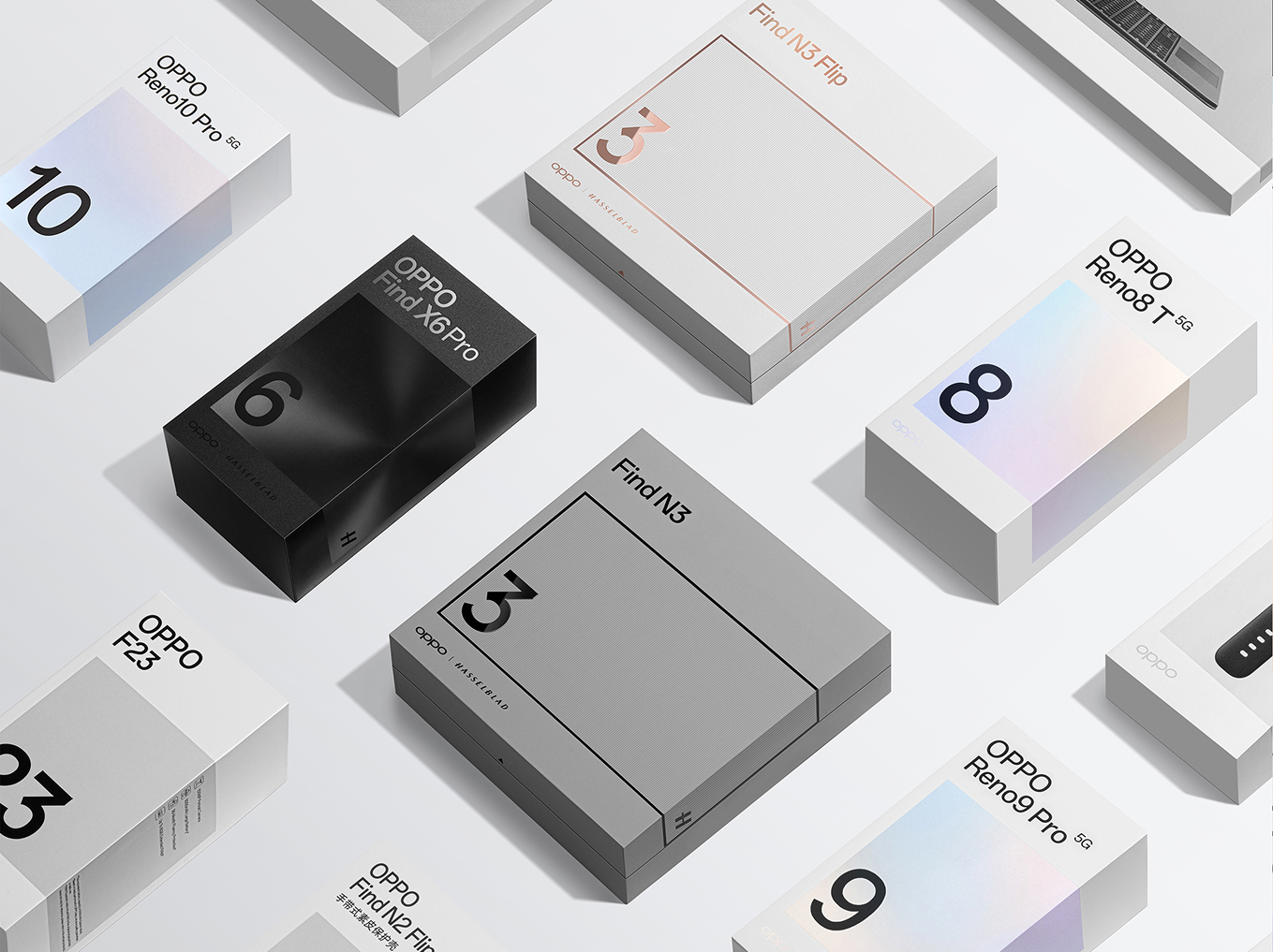 2023 年,面对依然激烈竞争的环境,我们升级了全球包装设计系统,以"家族化视觉"的全新面貌让大家重新认识 OPPO。
